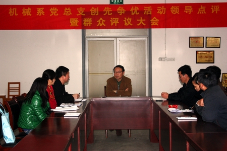 3月15日,机械工程系举行创先争优领导点评大会暨群众评议大会。学院党委书记廖洪元教授,学院党校副校长、系党总支书记陈方等系部负责人、各党支部书记、全体党员及群众代表参加了会议。会议由机械工程系系主任皮智谋主持。