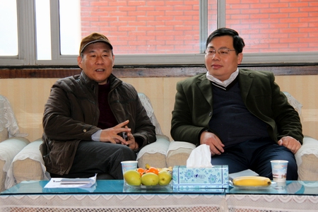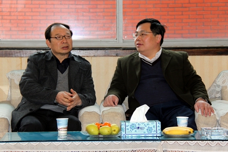 党委书记廖洪元(左)向兄弟院校同仁的到来表示欢迎