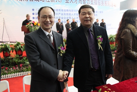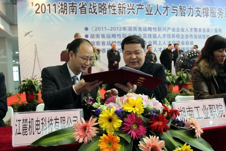 3月19日上午,由湖南省人力资源和社会保障厅、省经济信息化委员会主办的省战略性新兴产业企业提供人才和智力支撑服务系列活动在中国湖南人才市场启动。院长刘建湘应邀参会,并代表学院与湖南江麓机电科技有限公司现场签订了高技能人才培养合作协议。