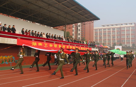 在激进昂扬的运动员进行曲中,伴随着入场解说,走在队伍最前列的是学院国旗队方阵和彩旗队方阵,在他们身后,刚从湖南省第九届大运会全胜归来的获奖队伍——我院田径代表队、女排代表队、男女篮球代表队,他们手捧奖杯、身披荣耀,向全院师生展示我院在大运会中取得的“金牌数量第一、女排第一、女篮第二、男篮第三、男子团体总分第一、女子团体总分第二”的好成绩。各系各专业的方阵队、代表队踏着坚定有力的步伐依次入场并接受主席台的检阅。他们矫健的步伐,响亮的口号,英姿飒爽的风采,充分体现了工院师生的精神面貌,缤纷的彩旗在红绿互动的辉映间,象征着工院希望的绽放和勃勃生机。