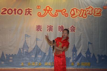 5月30日晚,由院工委、院关工委主办,院团委承办的我院教职工子女“2010年庆六一少儿才艺表演晚会”在大学生活动中心举行。孩子们在这里放飞童年的梦想,载歌载舞,会场内一派喜庆。
