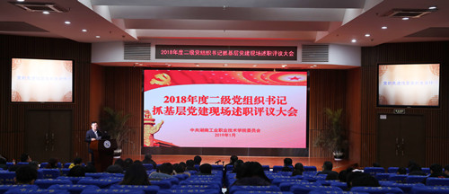 本网讯 1月4日,学校2018年度二级党组织书记抓基层党建现场述职评议大会在图书馆报告厅举行。学校党委委员及校领导、党务群团部门中层干部、各二级党组织书记、各二级学院院长、各基层党支部书记、师生党员代表参加本次会议。会议由党委副书记陈超主持。