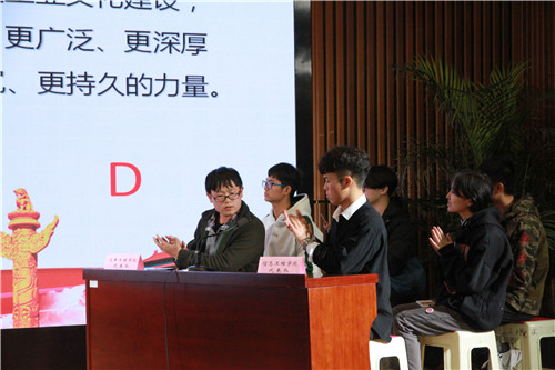 本网讯 “10月8日—19日,《平“语”近人——习近平总书记用典》在央视综合频道晚间播出,我校青马社微信公众号进行了连续转载。请问习近平新时代中国特色社会义思想的核心要义是?”题目在大屏幕上一出现,学生们迅速抢答。