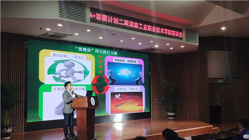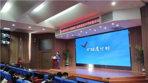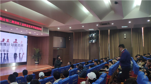 宣讲会上,贺正倩从该项目教学课程、实习安排、职业提升通道等方面进行了详细介绍;余中波则介绍了蓝思科技的主要产品和企业文化,对专班学生的工作岗位、待遇、企业课程、培养发展规划作了详细说明,并重点指出相较于社会招聘的高职毕业生,专班学生进入企业工作后的发展优势,鼓励同学们加入该项目。