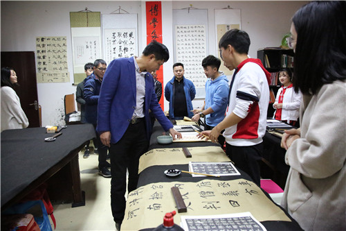 楚艺书法协会的同学们向校长一行介绍平时社团开展的主要工作和一幅幅学生作品的书法艺术风格。“这个社团的发展,你功不可没。”向罗生拍拍该社团指导老师之一、校团委副书记李陟威肩膀鼓励道。该学生社团骨干成员今年暑期开展的公益书法培训课程在师生中获得好评声一片,目前已成为学校会员数量最多的社团。