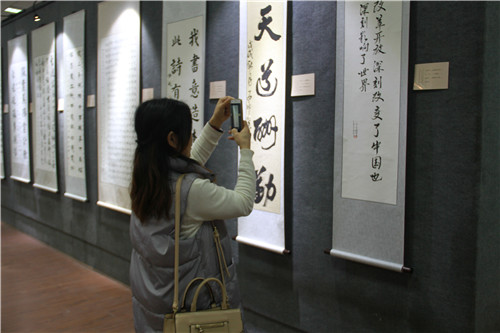 在场领导与师生们共同欣赏了现场展出的百余幅优秀书法、美术、摄影作品。观众们或驻足沉思、或拍照留念、或相互讨论。
