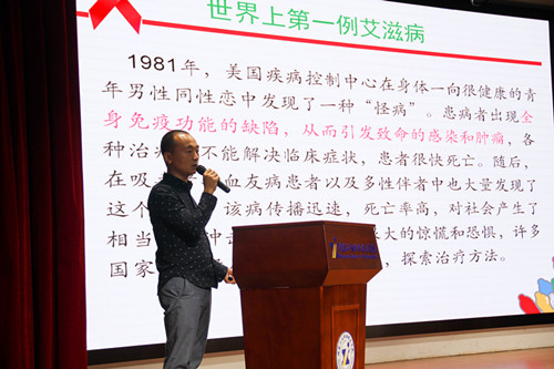 来自长沙市疾控中心的艾滋病防控专家陈剑向现场学生讲授艾滋病防治知识。陈剑从艾滋病基础知识、艾滋病疫情概况、艾滋病危害及预防、学生感染案例分享等四个方面进行了详细的讲授;他告诫大学生要充分引起重视,学习掌握艾滋病的基本知识,规范自身行为,预防感染艾滋病;同时呼吁高校师生都能积极传播防艾知识,让更多的人知道艾滋病、了解艾滋病、抵御艾滋病、远离艾滋病!