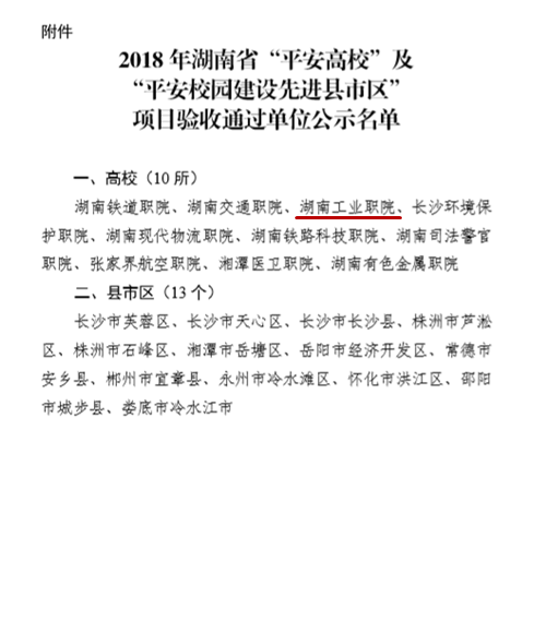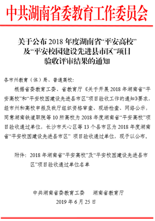 本网讯 6月25日,从省委教育工委传来好消息,经省委教育工委、省教育厅组织专家组考评,我校顺利通过2018年度湖南省“平安高校”项目验收。