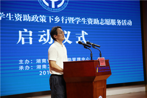 启动仪式上,王瑰曙强调,学生资助是重大的民生工程,是办人民满意教育的基础性工程。在省委省政府正确领导下,我省已经建立健全家庭经济困难学生资助体系,实现了“三个全覆盖”(所有学段全覆盖,所有公办和民办学校全覆盖,所有家庭经济困难学生全覆盖),和家庭经济困难学生“三不愁”(入学前不愁,入学时不愁,入学后不愁),全省每年发放各类学生资助资金50余亿元,资助家庭经济困难学生近500万人次。当前,脱贫攻坚进入决胜阶段,学生资助要为打赢脱贫攻坚战继续助力。深入开展学生资助宣传下乡行和学生资助志愿服务活动,是落实“不忘初心、牢记使命”主题教育的具体行动,是全省教育系统为打赢脱贫攻坚战不懈奋斗,积极作为的生动实践,也是坚持立德树人,推动大学生社会实践的有效途径,更是弘扬志愿服务精神、弘扬志愿服务文化的重要载体。他号召各普通高校、各市州和县市区学生资助部门要广泛动员广大教职员工和在校学生积极参与活动,走进乡村、走进基层、走进广大困难学生家庭,打通学生资助政策宣传“最后一公里”,助力乡村振兴。