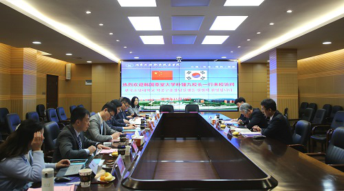 本网讯 11月18日上午,我校与韩国草堂大学签约仪式在办公楼2会议室举行,现场签署《友好合作备忘录》。