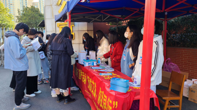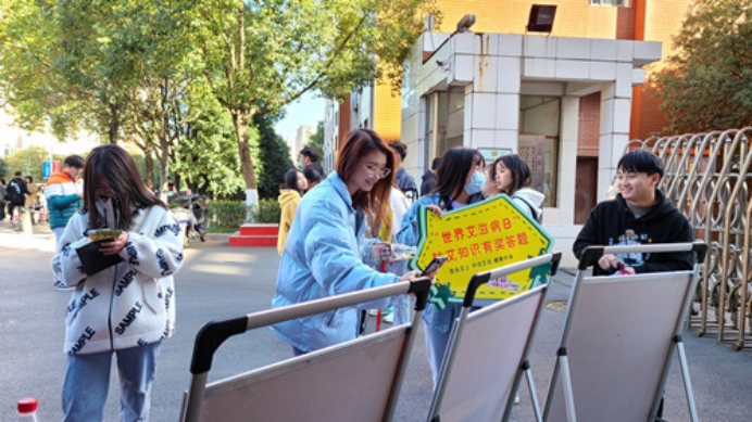 活动现场,学生志愿者们向师生发放宣传资料,介绍预防艾滋病的相关知识,同时号召同学们积极参与扫码答题。很多同学对艾滋病相关知识掌握得不错,很快完成答题且获得满分;有些同学会在仔细看过宣传折页后再进行答题,也能取得不错的成绩;也有一部分同学对蚊虫叮咬是否会传染艾滋病、目前艾滋病的主要传播途径及青年学生中存在的高危感染行为等还不清楚。每一位参与活动的同学通过答题对艾滋病有了更深入的了解,完成答题后即可领取到本子、笔、N95口罩等小礼品。参与活动的学校领导与同学们现场互动交流并在宣传横幅上签名、合影留念。