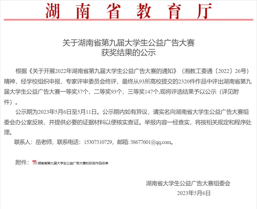 本网讯 近日,湖南省第九届大学生公益广告大赛获奖结果揭晓。我校参赛作品《乡村振兴路上的十八洞村》荣获大赛一等奖,《湘西·幸福路》、《梦想之船》获大赛二等奖,《为地球做件小事》、《“洞”见未来》获大赛三等奖。此次大赛由中共湖南省委教育工委、湖南省教育厅主办,以“青春新风尚 礼赞二十大”为主题。