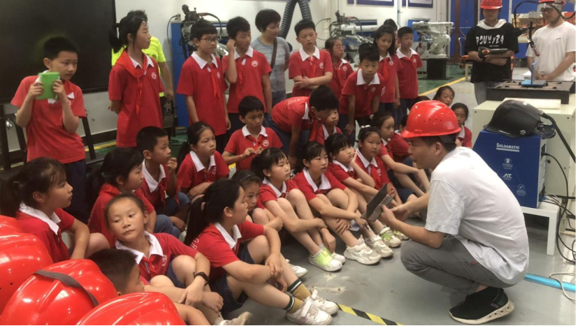 “机器人焊接是通过计算机程序来控制机器人进行工作,实现焊接自动化的过程。”小朋友们的第二站是智能焊接实训基地,罗杨老师和我校学生边操作边向小朋友们介绍智能焊接技术。小朋友们还带上焊接面罩,亲自体验智能焊接。“我以前只知道有人工焊接,原来可以通过机器人进行‘隔空’操作呀。”体验完智能焊接的张梓帆小朋友兴奋地说道。