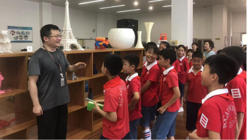 “哥哥姐姐们,你们快讲讲这是什么原理啊,这台机器有什么魔法吗?”来到3D打印实训室,小朋友们看到展台上陈列着的冰墩墩、马、哪吒等各式各样的3D打印模型,纷纷走向前去想要一探究竟。3D打印协会的学生边操作边介绍3D打印技术,“3D打印机喷头按照规划好的路径在二维平面内挤出熔融丝材,铺设在工作平台上,一层铺设完毕后,喷头抬升一个层厚高度,重新铺设一层堆叠上去,如此反复最终形成一个三维实体。”随后,小朋友们在协会成员的指导下有步骤地进行实操,当“打印材料”一层层叠加起来,形成一个模型,小朋友们发出“哇”的惊叹声。