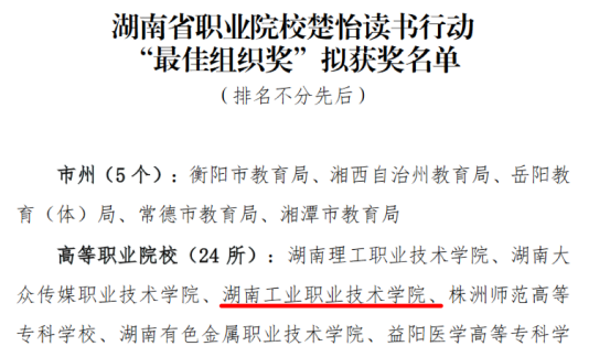 本网讯 近日,湖南省教育厅发布《关于公布湖南省职业院校楚怡读书行动“主题征文”“楚怡读书之星”“最佳组织奖” 评选结果的通知》,学校共获奖13项,其中获“主题征文”一等奖3项、二等奖4项、三等奖1项,唐春艳、郑志凌、王文灿、阮淑婷4人获评“楚怡读书之星”,学校获评楚怡读书行动“最佳组织奖”。