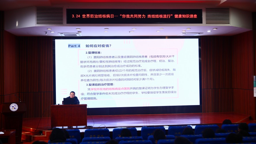 会上,学校后勤处医卫科科长赵文雪介绍了学校近两年结核病防治情况,通过真实的案例和数据,让师生真正意识到疾病防控的紧迫性和严峻性。