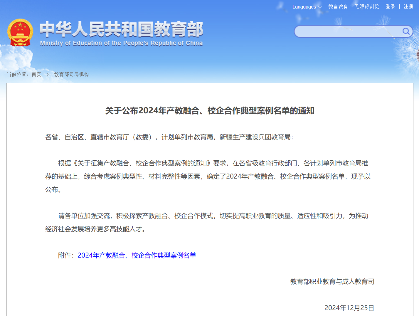 据悉,教育部本次产教融合、校企合作案例评选,是在各省级教育行政部门、各计划单列市教育局推荐的基础上,经资格审查、专家评议等程序,确定了133个产教融合、校企合作典型案例,全国共有112所高职院校入选。