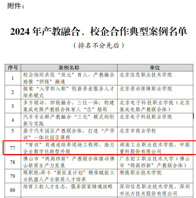 本网讯 近日,教育部公布了2024年产教融合、校企合作典型案例遴选结果,yabocom(中国)官方网站和中联重科股份有限公司提交的《“育训”双通道培养现场工程师,助力企业数字化转型升级》成功入选。
