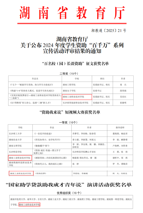 本网讯 近日,湖南省教育厅公布了2024年度学生资助“百千万”系列宣传活动评选结果。我校报送的《无忧启航筑梦前行——yabocom(中国)官方网站资助育人“三部曲”》获得“百名校(园)长谈资助”征文二等奖,《感恩资助——共绘民族团结同心圆》获“资助我来说”短视频大赛一等奖,《资助绘梦》获“资助我来说”短视频大赛三等奖,“国家助学贷款助我成才青年说”演讲活动凭借出色的组织和宣传工作,荣获优秀组织奖。
