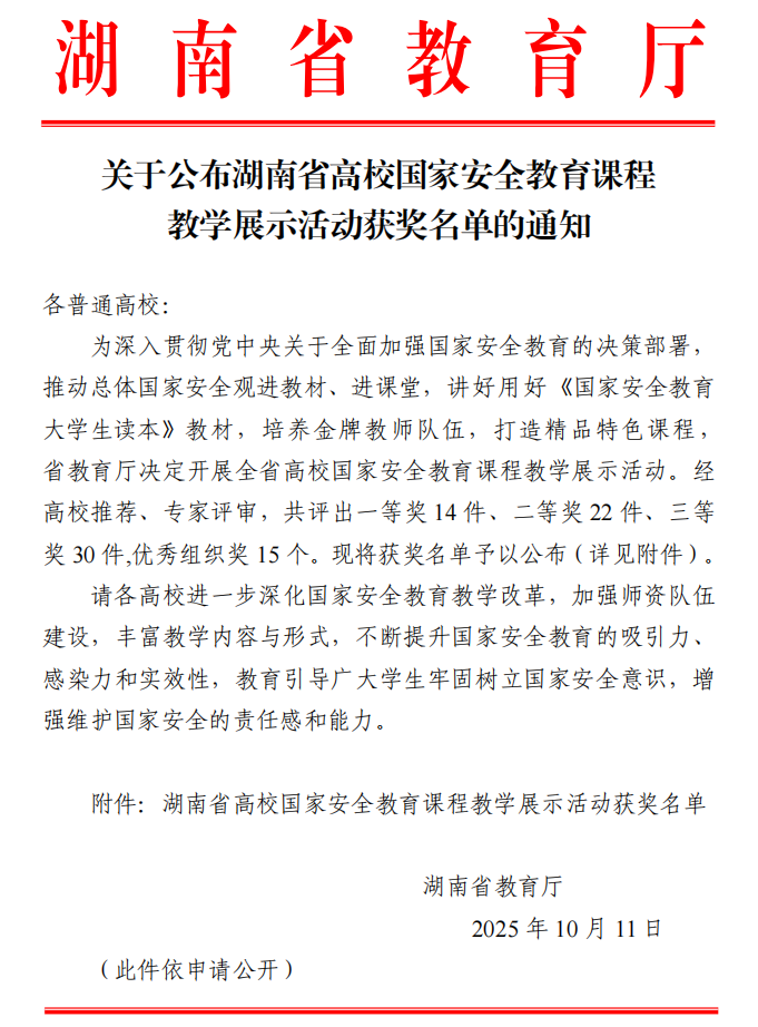 近日,由省教育厅主办的“湖南省高校国家安全教育课程教学展示活动”圆满落幕。我校马克思主义学院向桂珍、肖竺、冯秀云等教师团队荣获一等奖。