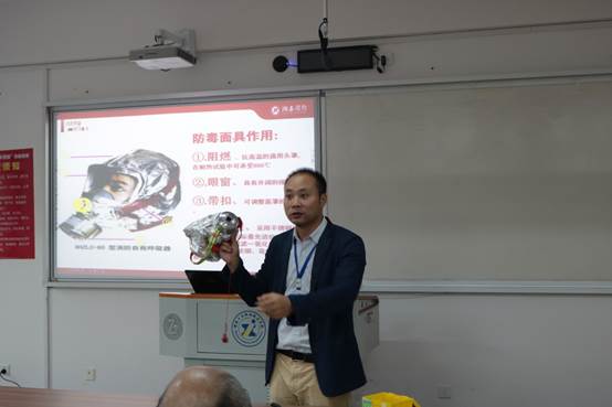 下午四点,消防知识专题讲座正式开始,湘安消防专家为师生们带来了一堂幽默趣味的安全知识讲座。他用生活化的语言对我们学习生活中会遇到的消防安全隐患作了详细介绍,重点介绍了插线板的安全使用、煤气天然气的安全使用与维护、车辆的防火措施及发生火灾时应该怎么做等方面的“干货”知识。随后,专家还详细介绍了灭火器、防毒面具等物品的使用,并手把手作了现场教学。