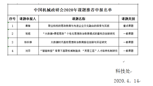 根据《中国机械政研会2020年课题研究指南》的通知,我校认真组织了此次申报工作,经校外专家评审,学校审核批准,拟推荐我校“职业院校的思政教育与先进企业文化融合的探索与实践”等1项重点课题和““大数据+课程思政”个性化思想政治教育模式的建构及创新研究”等3项一般课题申报机械政研会2020年课题,特此公示。评选推荐工作遵循公正、公平、公开原则,严格实行相关人员回避制度。如对评审结果有异议者,请在公示期内(4月14日-4月16日)向监察审计处反映,联系电话82946125。