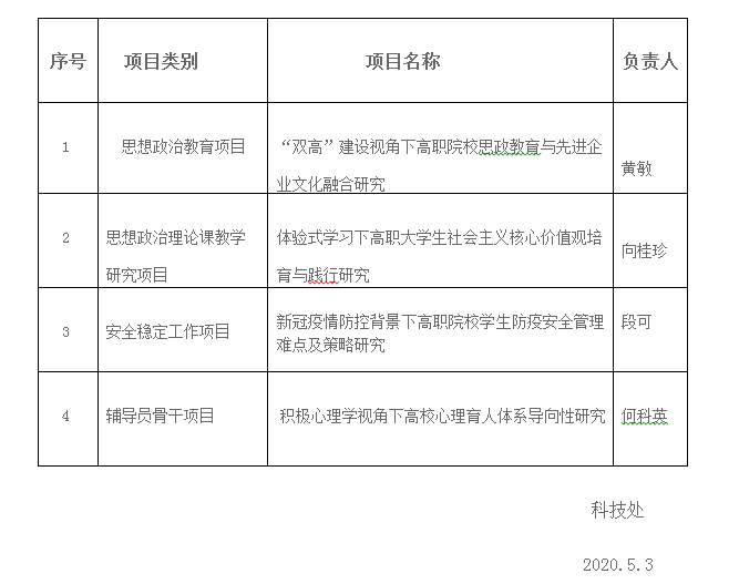 根据湘教工委通[2020]6号文件的通知,我校认真组织了此次课题申报工作。在校监察审计处的监督下,经专家评审,按打分情况排名,拟推荐我校““双高”建设视角下高职院校思政教育与先进企业文化融合研究”等共4项课题申报2020年度省高校思想政治工作研究项目,特此公示。(以下排名不分先后)