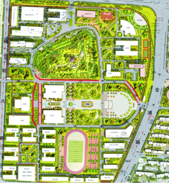 图中东大门右边至行政楼两侧、长丰路靠鹤鸣山一侧、中联路两侧、图书馆前坪两侧红色标记部分为禁停区域