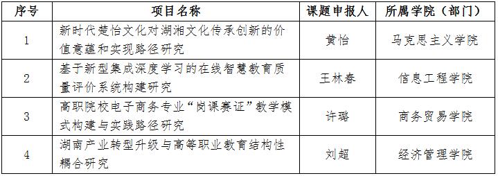 根据省教育厅《关于申报2022年度湖南省教育厅科学研究项目的通知》和我校《关于组织申报2022年度湖南省教育厅科学研究项目的通知》的通知要求,在纪检监察处的监督下随机抽取校外专家对申报的52项项目(含优秀青年项目11项、一般项目41项)进行评审,评审结果经学校审核批准,现将拟推荐项目公示如下: