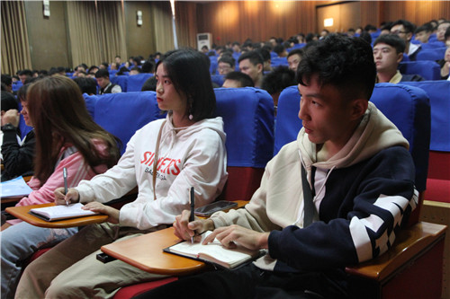 在90分钟的讲演过程中,龙卫国结合自身学习和工作经历,为同学们诠释“奋斗的青春最美丽”。据介绍,大学毕业后,龙卫国经历轮番淘汰制最终留在中联重科,因娴熟的掌握了电气自动化、液压、电焊等各项技能,由售后服务工程师摇身一变“起重机吊臂装配员”。在装配、调试技能比赛中,一次又一次荣获第一,脱颖而出,并不断提升自我,逐渐成长为企业技术骨干,并组建技能大师工作室,为企业培养了更多骨干力量。“要努力用闪光点征服大家,‘英雄’才有用武之地。”他坚定说道。