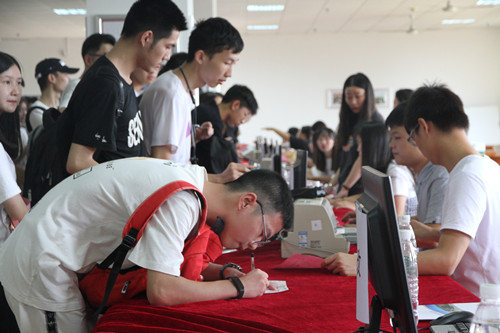 校园内随处可见新鲜面孔,新生和家长们或按报到指引标志或由迎新志愿者带领前往报到流程的相应地点,依次有序完成资格审查、缴学杂费或标注学杂费批扣情况、自愿领取床上用品、办理团/党组织关系迁移、提交个人纸质档案、安排入住学生公寓等手续。