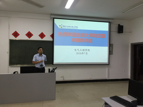 7月10日下午,中联重科技能大师龙卫国来我校电气工程学院讲座。被誉为“中国汽车起重机调试第一人”龙卫国先后担任20余项新产品的调试第一负责人。龙卫国给教师们梳理了中国高端制造业的发展概况和未来前景,并讲述了自己凭借技术创新为公司创造巨大经济价值的故事。