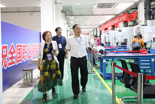 应若平一行依次检查了赛场内各工位数控设备运转和调试情况,查看了赛场、选手休息室、选手工具存放区、技术支持室、评分裁判工作室、保密室、比赛观摩室等场地环境,听取赛项赛务组、技术组等各组负责人对相应工作情况的汇报,对进一步按国赛标准规范工作流程提出了指导意见。