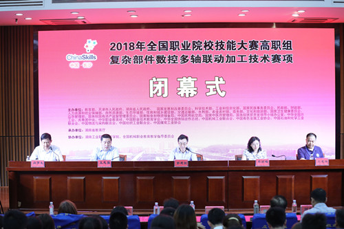 郭建国宣布:2018全国职业院校技能大赛高职组“复杂部件数控多轴联动加工技术”赛项闭幕。