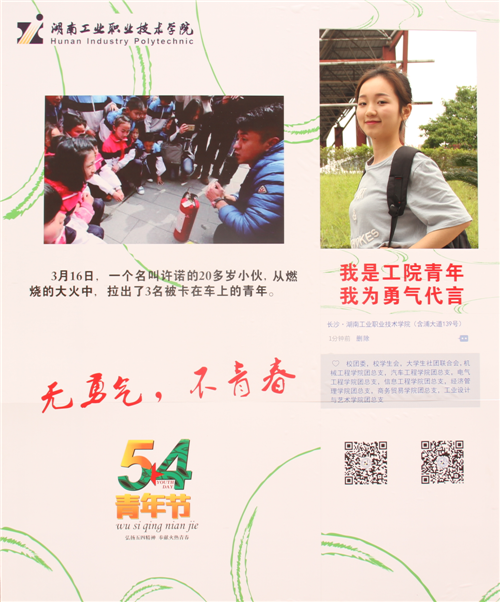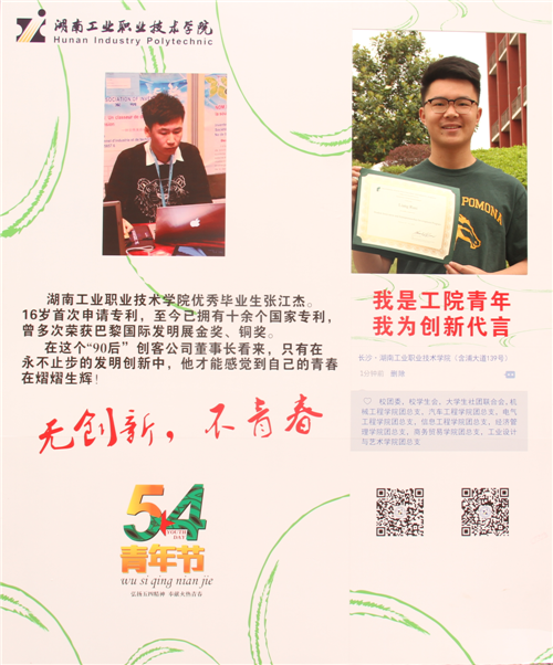 胡旭同学选择在“我是工院青年,我为创新代言”展板下留影。他说,展板上的主人公是我校优秀毕业生张江杰,也是巴黎国际发明展金奖和铜奖获得者。而胡旭本人也曾获得2016湖南省直“挑战杯”金奖、2017黄炎培创业大赛三等奖,他希望能以学长为榜样,更加努力实现自己的人生目标。