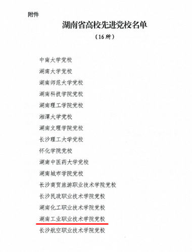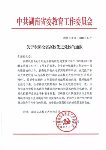 2017年5月,湖南省委教育工委对本省各高校党委发布了《关于开展全省高校先进党校评比工作的通知》,我校积极响应,坚持以评促建、以评促改、以评促发展,推动学校党校建设再上新台阶。通过自评、自主申报、初审、实地考察等阶段,我校最终被授予“湖南省高校先进党校”称号。