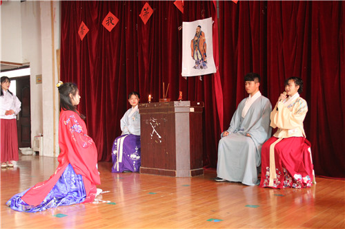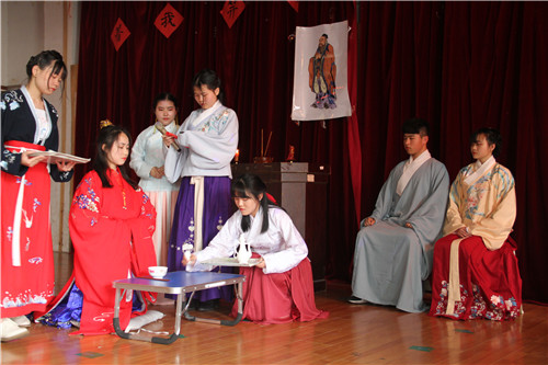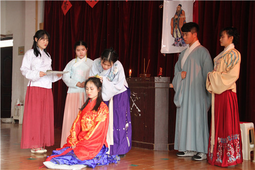 活动现场座无虚席,还有不少外校社团同学吸引了学生记者的注意。文颖峥表示,随着人们对汉服的熟知度提高,热爱汉服的人也越来越多,“除了校内社团活动,我们还经常去参加高校文学社团交流会,与‘同袍们’一起着汉服猜灯谜、知识竞答等,建立了深厚的友谊。这次我校汉式成人礼,他们就都到现场助阵了。”