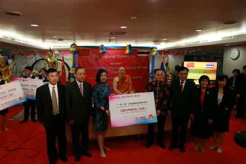 2月6日,代表团与泰国职业教育中心、职业院校签约仪式在曼谷金佛寺举行。泰国隆财基金会主席赵昆通猜大师、泰国职业教育委员会副秘书长奔颂·詹巴坡先生、唐风董事长刘飞女士以及泰国职教委官员、职教中心主任、中泰院校领导等共计200余人出席了当天的签约仪式。我校分别与泰国南部一区职教中心、南部二区职教中心、南部三区职教中心、泰国北部二区职教中心和泰国东北部五区职教中心就专业建设、人才培养等内容进行了合作备忘录的签署。同时,我校联合湖南交通职业技术学院、唐风集团,向隆财基金会捐赠了40个职业教育短期项目奖学金名额,以支持泰国职业院校的优秀学生到中国进行短期交流,提供深入了解中国的机会,以激励学生更好的学习和进步,吸引泰国学生来华留学。