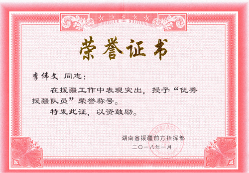 湖南省援疆前方指挥部授予李伟文“优秀援疆队员”称号