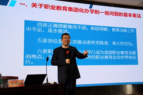 关于当前职业教育集团化办学面临的一些问题,许世杰主要谈了六点看法:一是历经20多年发展变革的职业教育集团化办学,来自于实践,产生于基层,是当前和未来一段时期开展职业教育各项工作的关键抓手;二是其符合世界高等教育和职业教育发展的普遍规律,是基于产教融合校企合作的重要载体和有效途径,是完善职业教育和培训体系的重要实现形式;三是在现有体制下要大胆探索,要用勇气、担当、胸怀、魄力,不等不靠积极想办法;四是要正确理解集而不团、抱团取暖,看清当前工作中的不足,逐步改进;五是领导老师们是真正的推动者和实践者,将大有可为;六是职业教育集团化办学已成为我国职业教育发展的亮点,并逐步成为中国特色职业教育走向世界的名片。