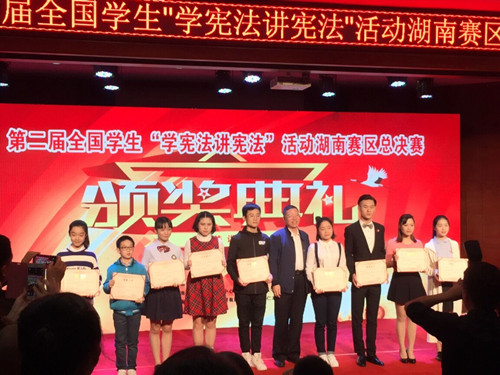 总决赛历时一天,紧张而有序,激烈而精彩。比赛中,同学们结合自身学习经历、感悟和时政热点,从讲宪法故事、对宪法的认识与体会、论时政热点中的法律常识、谈宪法精神等多个角度,充分展现了湖南省当代青少年的宪法知识水平。我校向粤同学以《网贷,请仗法律之剑》为题,短短5分钟的演讲,她以鲜明的观点、生动的事例、真切的情感,声情并茂地展现了自己对宪法的认识,具有较强感染力。经过激烈角逐,向粤获高校组一等奖。