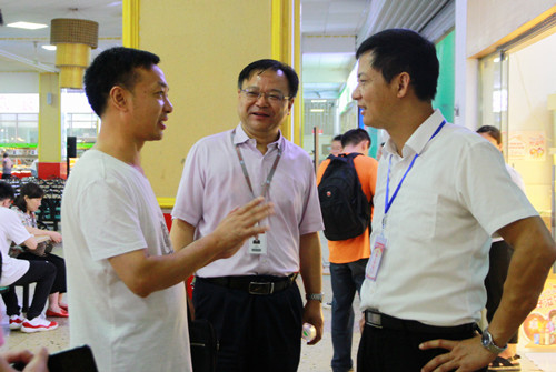 食堂内,学生家长与校长向罗生(右)、党委副书记陈超(中)交流教育理念