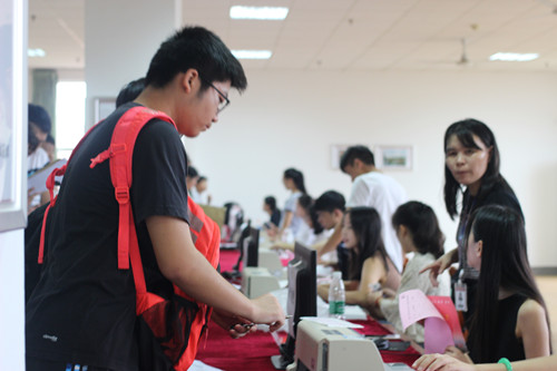 新生在各报到流程点前有序排队,工作人员耐心细致服务