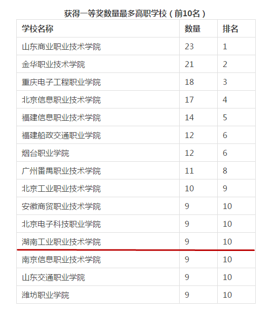 本网讯 8月17日,教育部职业教育与成人教育司发出公告,公示了2017年全国职业院校技能大赛一、二、三等奖获奖选手、优秀指导教师及所在学校名单,并统计了全国各省市高职组获奖情况和获得一等奖数量最多高职学校(前10名)等。其中,湖南高职院校总共获得48个一等奖,我校获得9个一等奖,成功进入“一等奖数量最多高职学校(前10名)”名单。