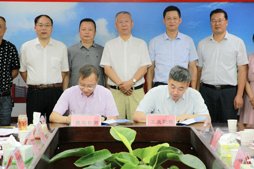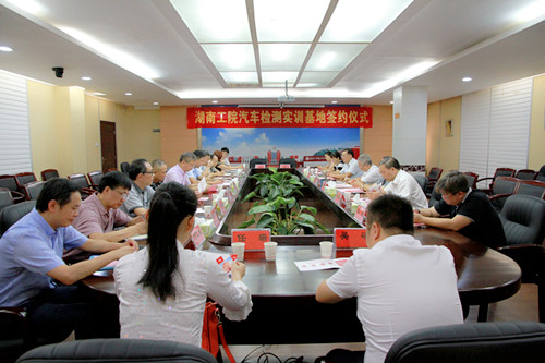 随后,双方进行了签约仪式。我校副校长董建国和长沙捷运汽车检测有限公司总经理佘文高代表合作双方共同签署了《共建汽车检测实训基地协议》,合作期限为21年。据悉,此次合作从项目提出到论证确定从实、施方案构思到目标敲定、从谈判小组的组建到达成共识,历经三年。该项目建成后,将为长沙岳麓科技产业园经济发展、为检验检测人才队伍建设,为促进湖南装备制造迈向新高度,为建设制造强省贡献力量。