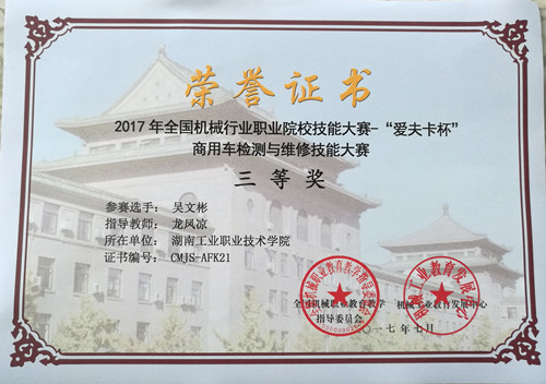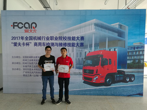 本网讯 7月15日至19日,由全国机械行业指导委员会承办,深圳爱夫卡设备有限公司赞助的首届“爱夫卡杯”商用车检测与维修技能大赛在长春汽车高等专科学校举行。全国总共有42支队伍参赛,我校参赛队由汽车工程学院龙凤凉老师及汽运s15-3班学生黎清林、汽运s15-3班学生吴文彬组成。