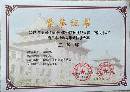 经过激烈比拼,汽运s15-3班学生黎清林和汽运s15-3班学生吴文彬均获得比赛三等奖。