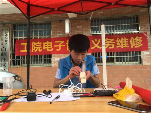 5月22日,我校电子协会来到白鹤社区,为社区居民开展家电义务维修、安全用电常识宣传等系列活动。活动中,同学们分工明确、有条不紊,安全用电常识宣传小组耐心讲解生活中的用电常识,家电义务维修小组认真维修每个“生病的”电器,而接待服务组的同学则认真对每件物品进行编号和登记。在居民送来的物品中,无论是电饭锅、热水炉、电风扇等,同学们都认真检查、维修,并讲解损坏的原因及其使用时注意事项等。看着自己曾损坏的电器又能正常使用,居民们个个脸上乐开了花。