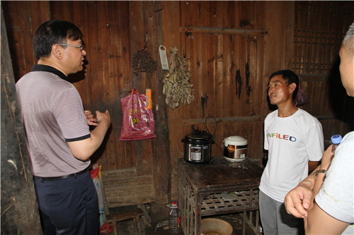 我校党委副书记陈超(左)察看贫困户居住环境并询问他们生产生活情况