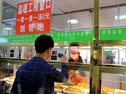 为缓解贫困大学生的实际生活困难,我院从2010年开始实施“温暖工程窗口”。窗口的饭菜和大众窗口同出一锅,学生可在大众窗口的荤菜和素菜中各选一样,标准为2元一荤一素一汤饭管饱。开始试点时,范围涵盖120名品学兼优的贫困学生。经过试行、摸索经验,逐渐扩大“温暖”面。如今,这一举措已累计超过1200余名贫困学子受惠。